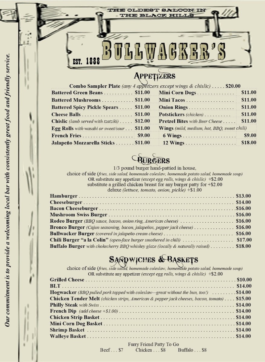 Introducing the menu at Bullwacker's Saloon & Steakhouse is a delightful experience steeped in rich history and local flavor. Established in 1888, this iconic saloon is not just a dining destination but a testament to the culinary heritage of Whitewood, SD. Patrons rave about their mouthwatering ribeyes and perfectly cooked bison burgers, often noting the exceptional service that enhances the dining experience.